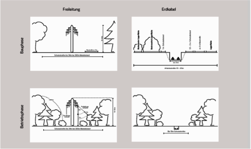 Die folgenden Abbildungen zeigen die technische Ausgestaltung der beiden Varianten Freileitung und Erdverkabelung in Bezug auf Masthöhe, Leiterseile, Schutz- sowie Arbeitsstreifen bei einer Neubautrasse in der Bau- sowie Betriebsphase. Die technischen Vorgaben (siehe Abbildungen) sind beim Neubau von Stromtrassen immer dieselben. Bei Bedarf sich ortsabhängig weitere technische Anpassungen möglich.